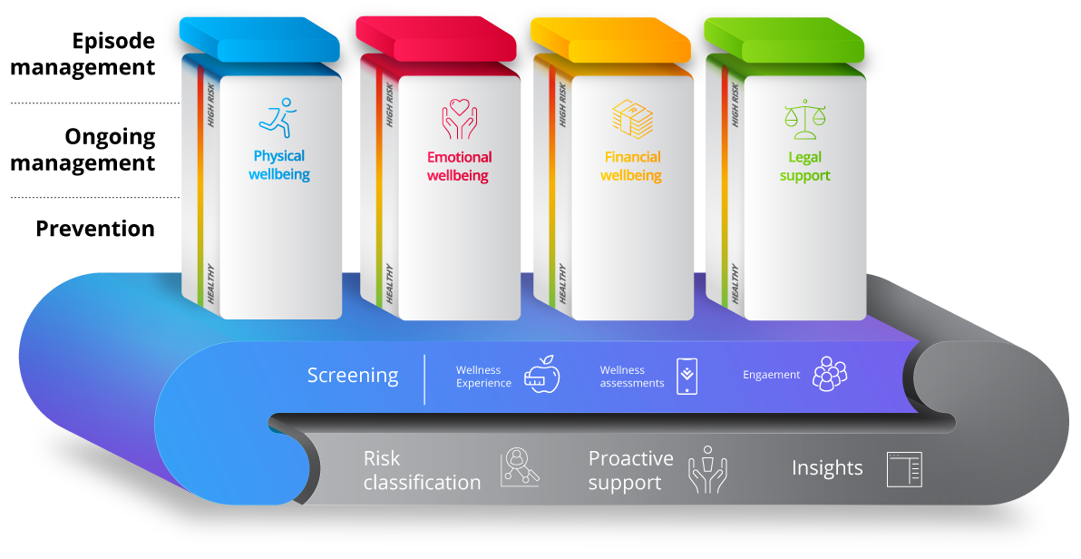 Healthy Company offers various levels of interventions depending on the plan type. From prevention and education to episode or ongoing management across physical, emotional and financial wellbeing, as well as legal support.